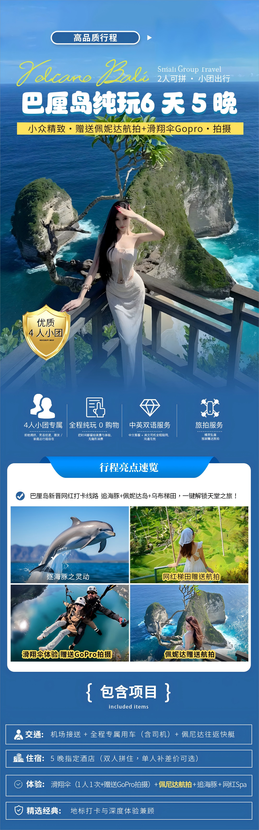 路线名称:印度尼西亚巴厘岛·纯玩6天5晚英文4人团进阶版(含滑翔伞+ATV)